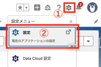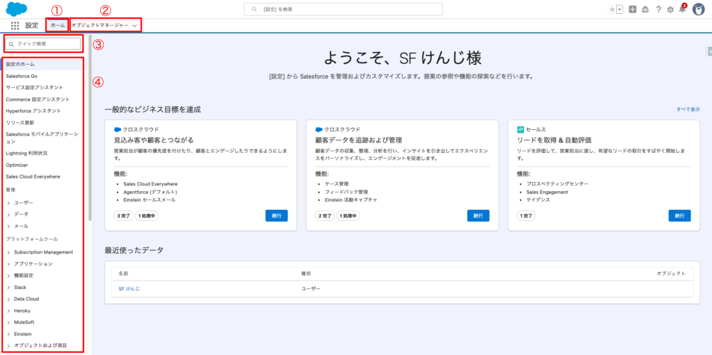 - ホーム:設定画面を開いた直後に表示されるトップページです。おすすめ設定や最近のシステム情報、学習リソース(Trailheadリンクなど)がまとめられています。