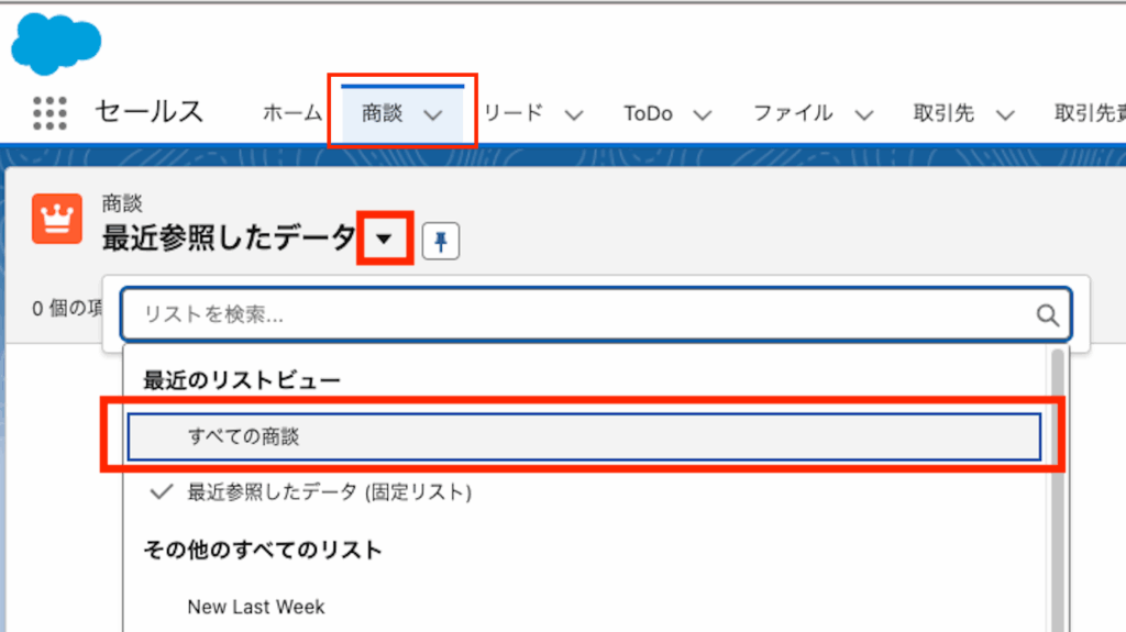 - 商談リストビュー画面が開きます。初期表示では「最近参照したデータ」が設定されています。
