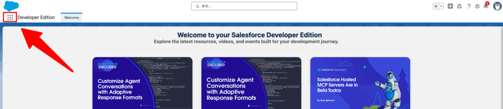 - Salesforceにログインすると、最初に「App Launcher(アプリケーションランチャー)」のアイコン(左上の9つの点のグリッド)があります。