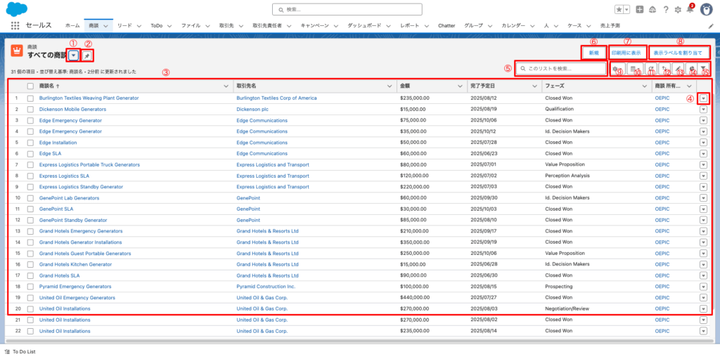 - すべての商談レコードが一覧で表示されます。このリストは列の並び替えやフィルタ変更も可能です。