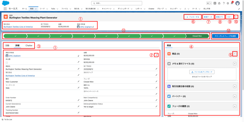 - 商談フェーズパス:商談レコードの進捗を示すビジュアルバー。ステージごとに色分けされ、ドラッグ操作で進捗フェーズを更新できます。
