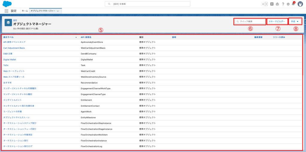 - オブジェクト一覧:オブジェクトマネージャー内で、組織内のすべてのオブジェクトが一覧表示されます。標準オブジェクトとカスタムオブジェクトが区別され、アルファベット順で並んでいます。