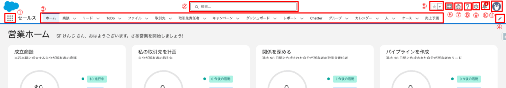 Sales Cloudを開くと、画面上部にはSalesforce全体を操作するためのメインメニューやショートカットが配置されています。