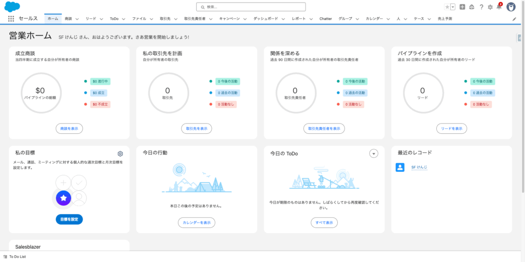 ホーム画面は、Salesforceにログインした直後に表示されるページで、日々の業務の出発点となります。